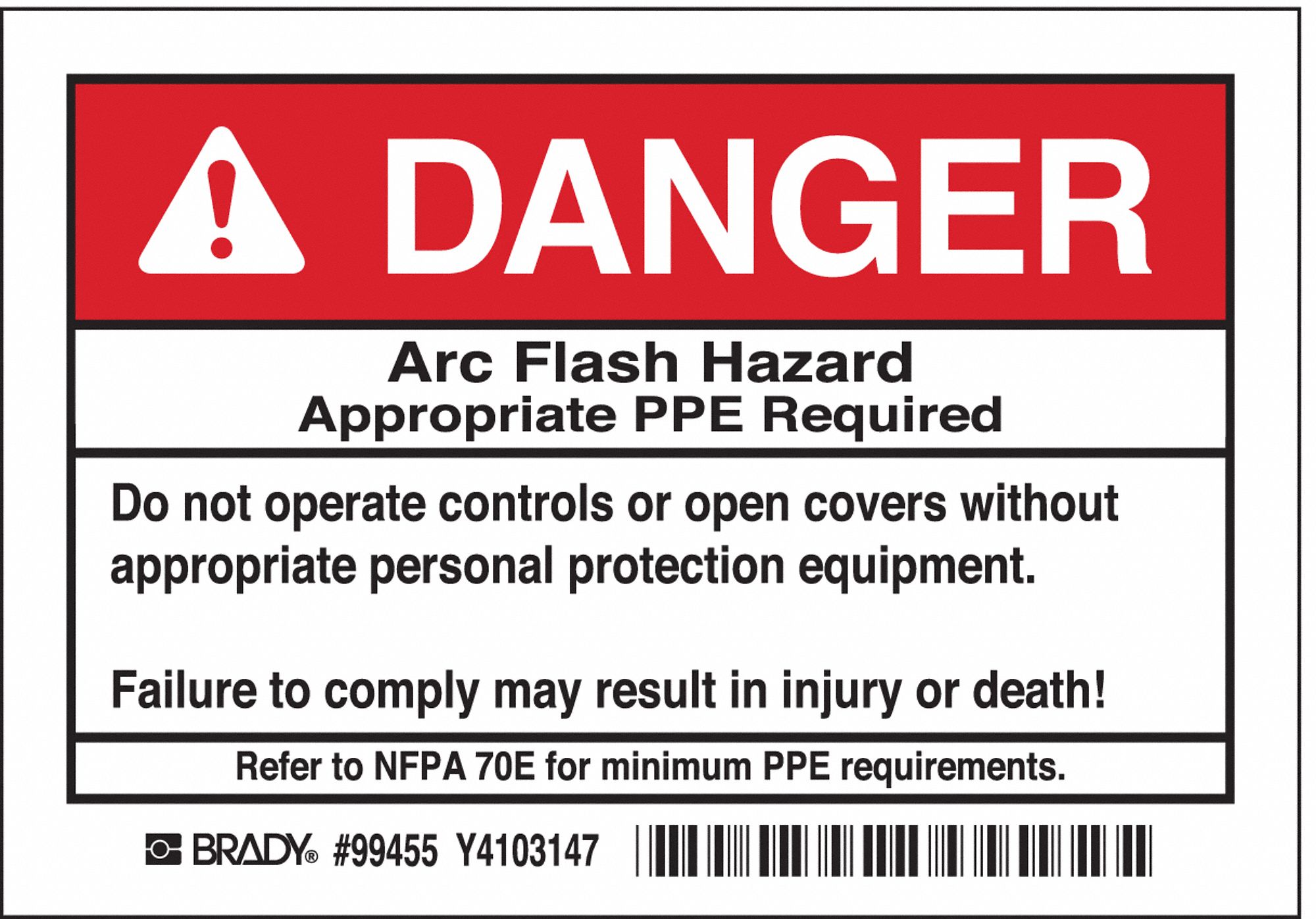 Brady Part 121098 Danger Arc Flash Hazard Appropriate Ppe Required Labels Bradyid Com