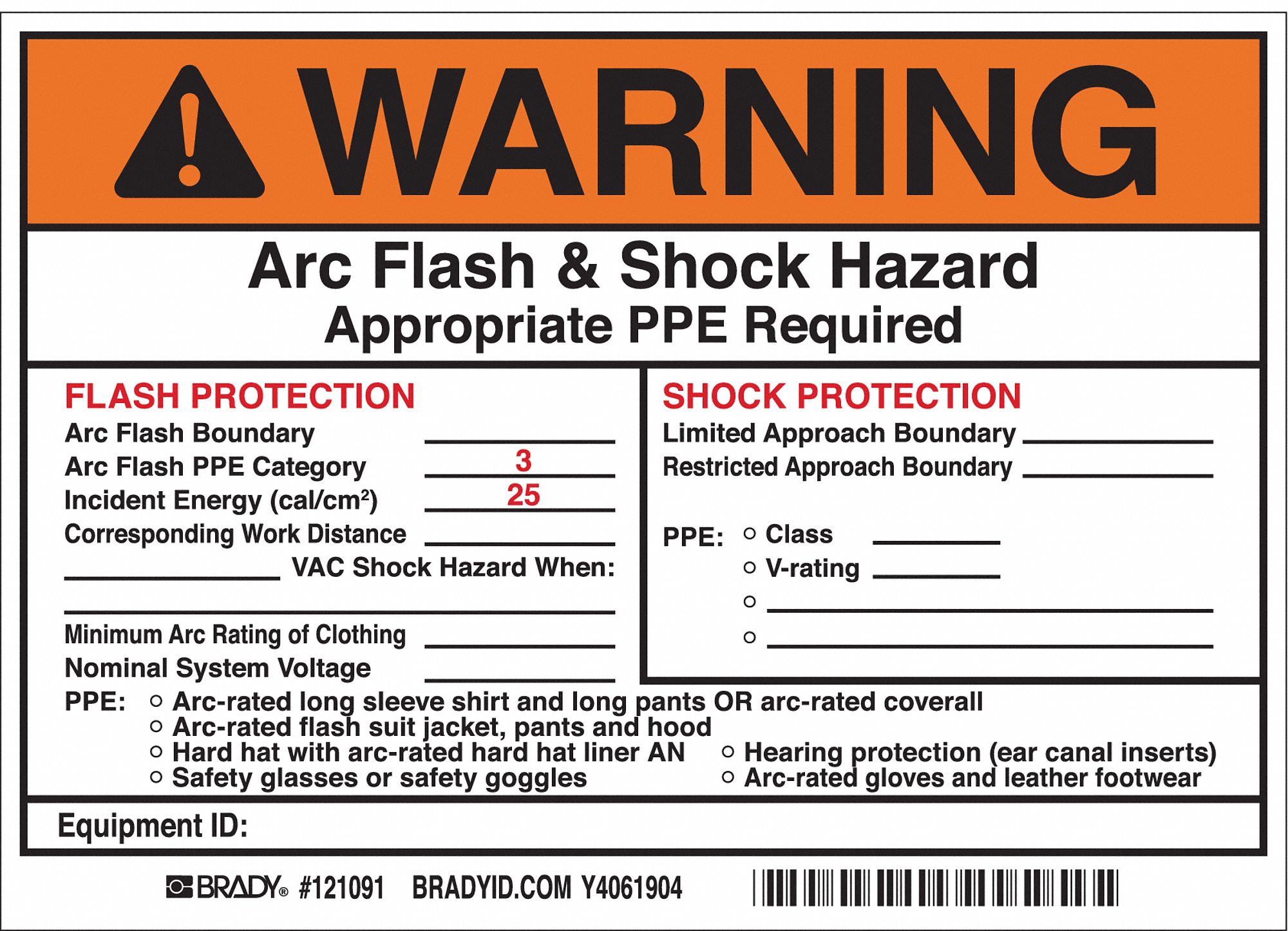 Brady Part 101517 Warning Arc Flash And Shock Hazard Labels Bradyid Com